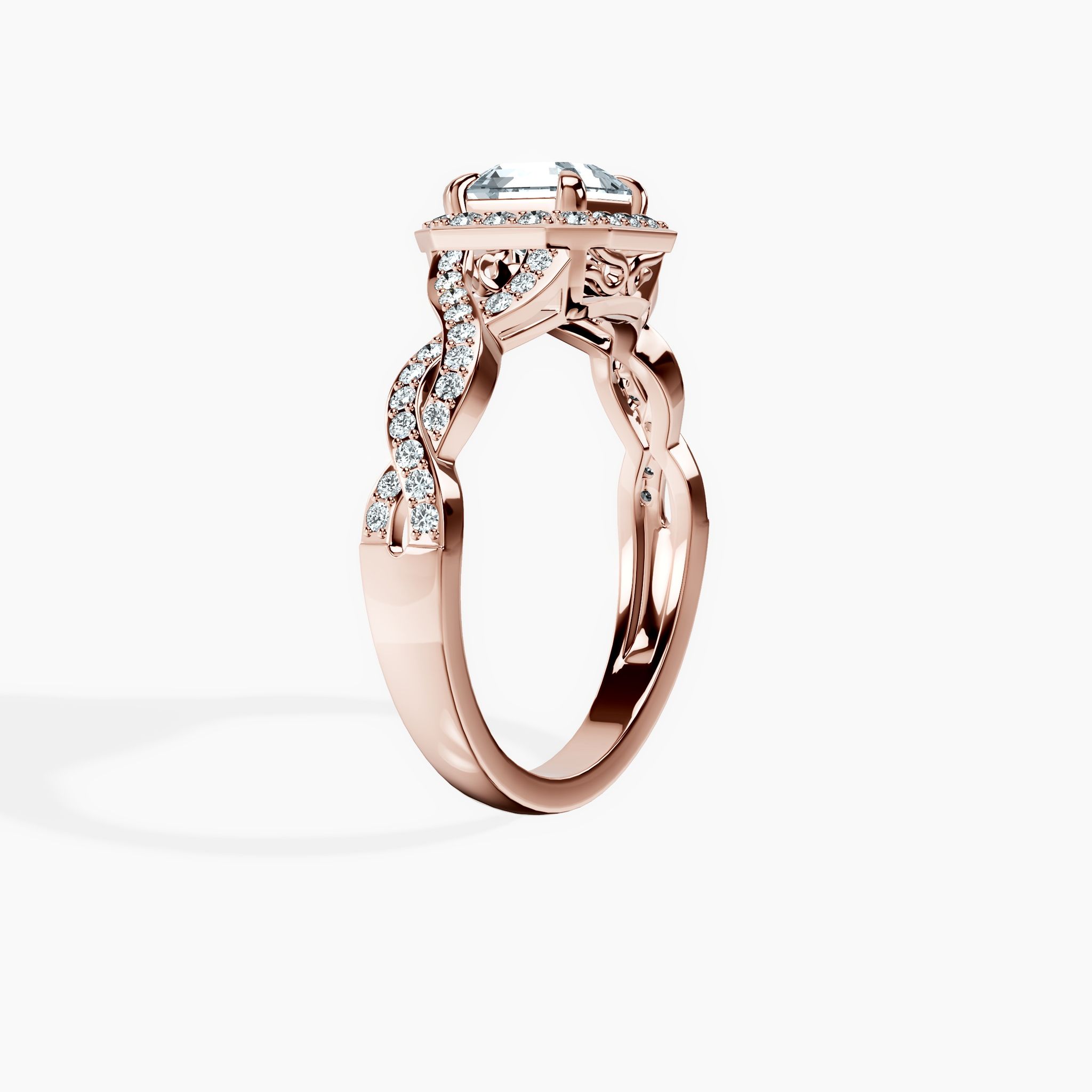 The Halo Entwined Asscher Ring showcases the unique beauty of the Asscher-cut center stone, surrounded by a dazzling halo. Its entwined band design adds a touch of sophistication and modern elegance, making it the perfect engagement ring for those who desire a classic yet distinctive style. With its timeless appeal and intricate craftsmanship, this ring offers a luxurious and unforgettable statement.